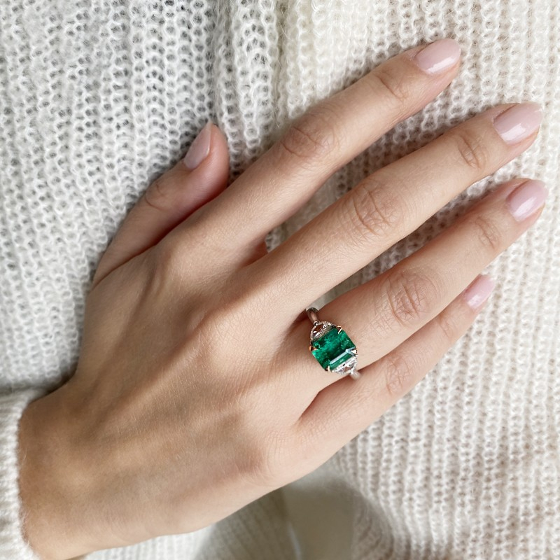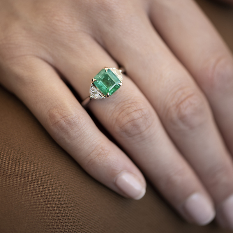 L'alliance d'une émeraude centrale et deux diamants, dont la taille demi-lune est un motif typique de l'Art Déco, contribue au charme raffiné de la bague.