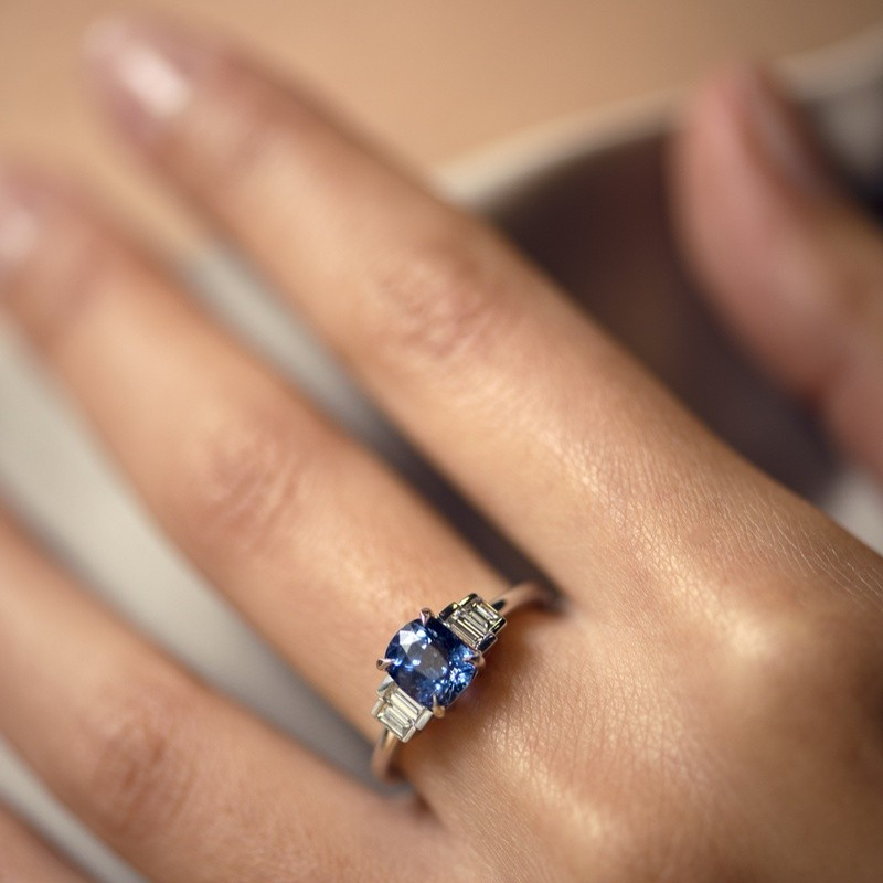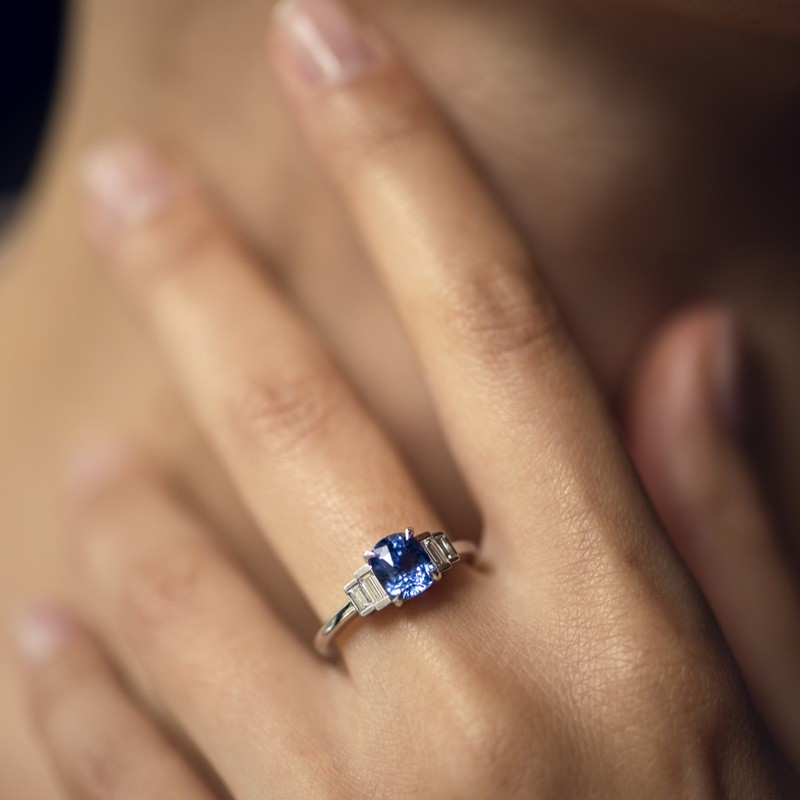 Cet élégant anneau au motif étagé est serti de diamants taille baguette. La succession des sertis large et fin pousse à l'extrême le graphisme de ce modèle tandis que le saphir naturel de Ceylan, au bleu profond et incomparable, ce dévoile ici dans toute sa magnificence.