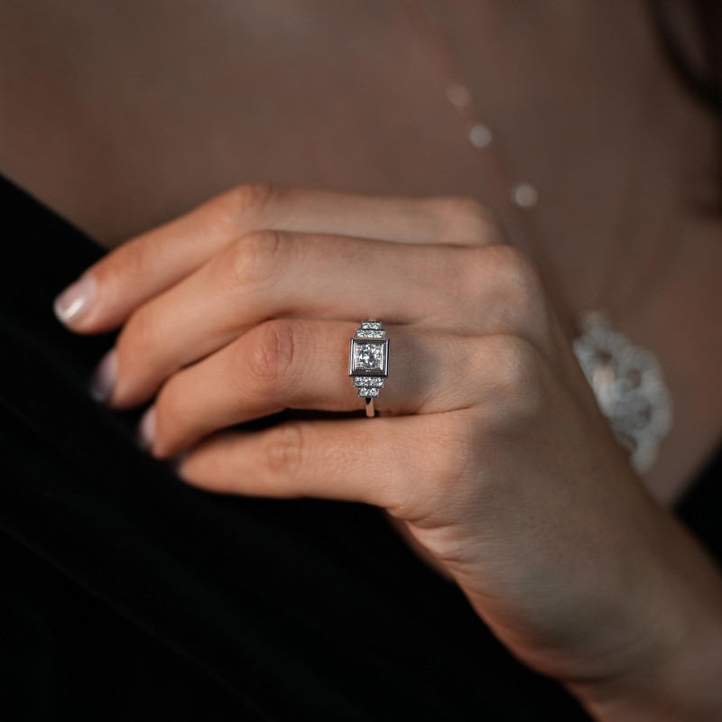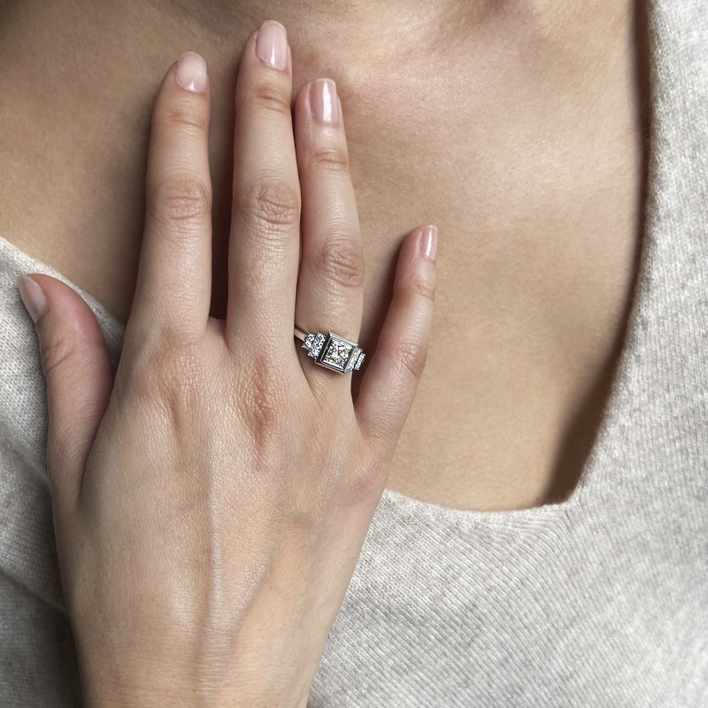 Puissance et caractère font de cette bague de style Art déco une valeur sûre. La construction parfaite de cet escalier de diamants était très en vogue en 1920 et reste intemporelle.