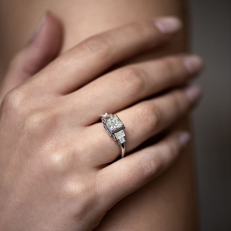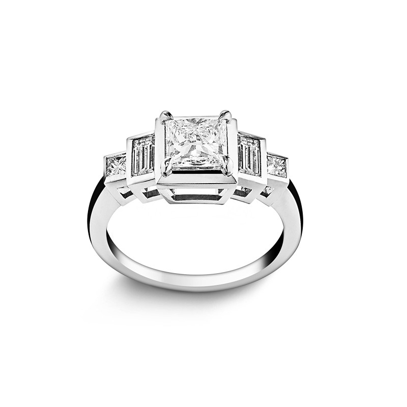 Le design perfectionné de la bague Art Déco Stairs se pare en son centre d’un diamant princesse. Résolument moderne, cette taille particulière de diamant revient dans la joaillerie. La construction parfaite de cet escalier de diamants était très en vogue en 1920 et reste intemporelle. Grâce à l’utilisation de diamants baguettes, la taille princesse est mise à son avantage.