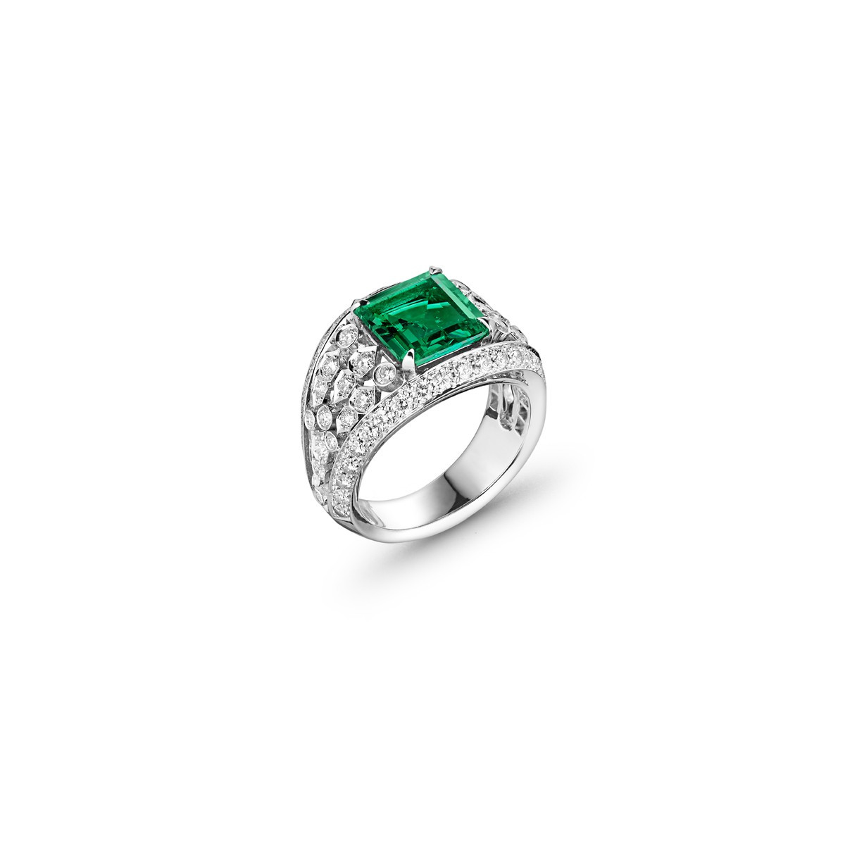 Ornée d'une sublime émeraude au vert profond, la bague constellation émeraude tire son inspiration dans la contemplation des délicats motifs de la voûte céleste. Des diamants mis en valeur par l'emploi judicieux d'un serti en nid d'abeille ornent ainsi la bague, soulignant l'essence stellaire de cette somptueuse création.
