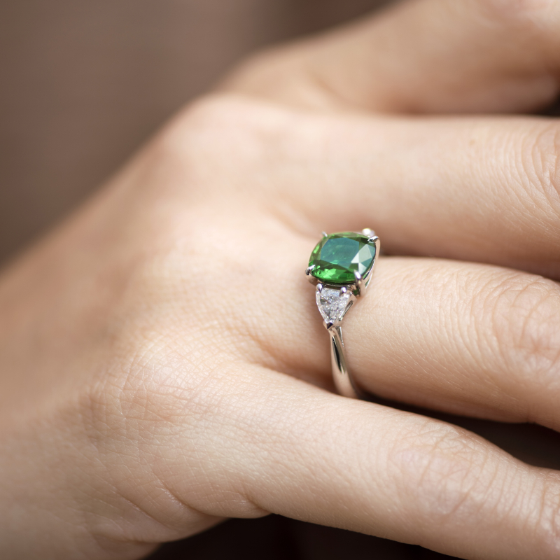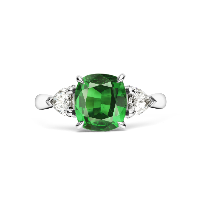 Une triade de gemmes apporte un twist à ce modèle Art déco créé sous le signe de la légèreté. Le corps de bague légèrement pincé affine le bijou en lui ajoutant une grande délicatesse tandis que les deux diamants triangles mariés à la vive profondeur de la tsavorite confèrent classe et élégance à cette bague singulière.
