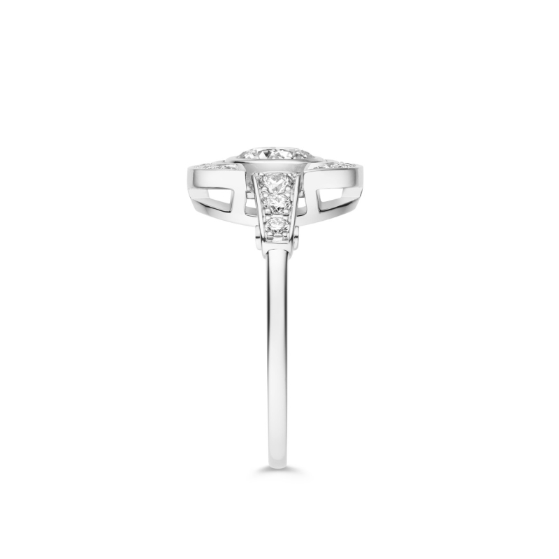La bague Erstwhile est l’évolution créée à partir de notre solitaire Erstwhile, elle se démarque avec l’ajout d’un entourage de diamants légèrement incliné pour sublimer le diamant central en serti clos et affirmer davantage son style Art déco.