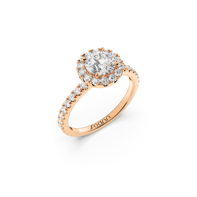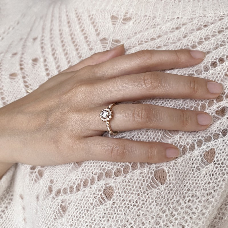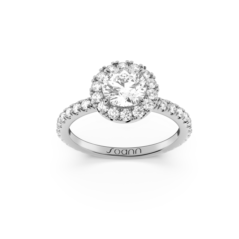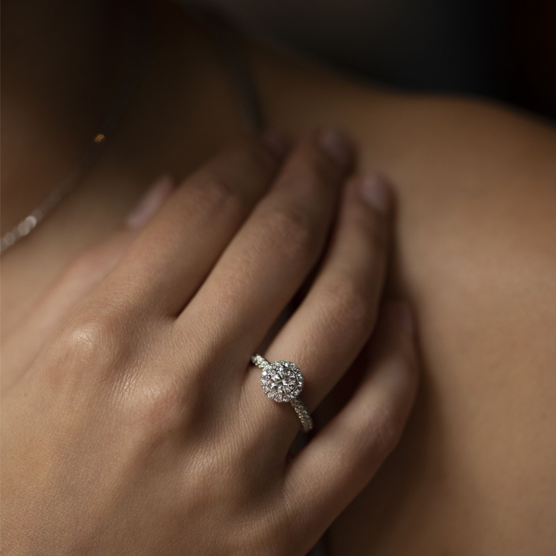 Le solitaire Eternité est la bague de fiançaille par excellence pour les fiancées souhaitant un modèle intemporel et scintillant. La pierre centrale est entourée d’un halo de petits diamants, telle une couronne étincelante. Un anneau fin, pavé délicatement supporte ce délicat chaton brillant de mille feux.