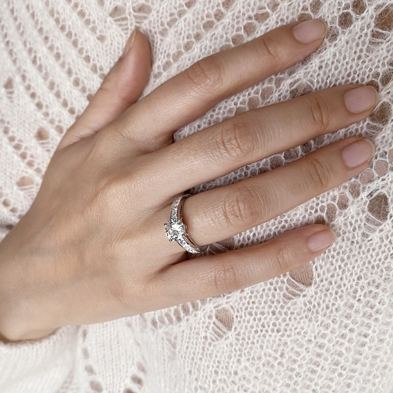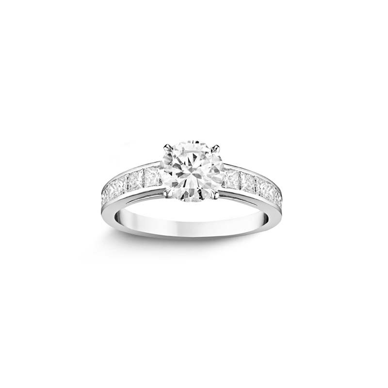 Solitaire élégant où la finesse du serti de la pierre centrale est mise en exergue par la large bande de diamants du corps de bague. Les diamants taille princesse forment ainsi une rampe lumineuse sur laquelle glisse le regard avant d'être happé par la pierre centrale et ses milles facettes.