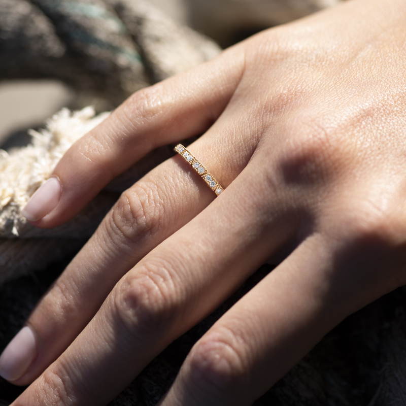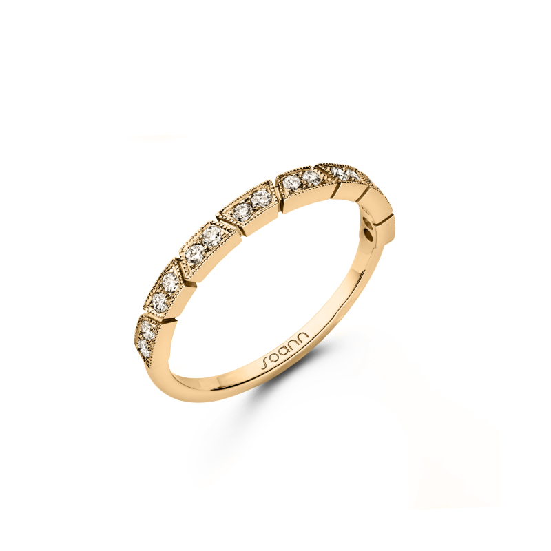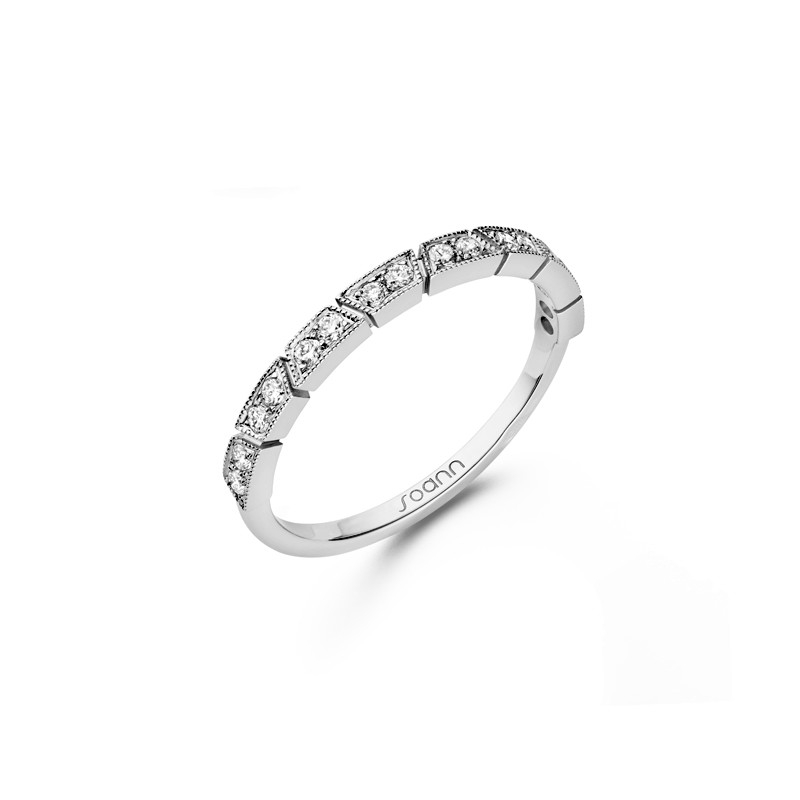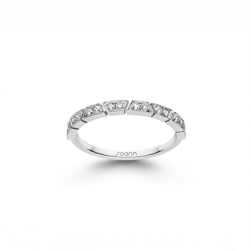 Naissance du jazz, courbes et enchaînements dansant de la géométrie Art Déco. L’alliance Charleston est fine et élégante avec un serti millegrain qui fait briller les diamants d'une façon, dansante. Intemporel mariage réussi de l'art déco sur des lignes Soann contemporaines.