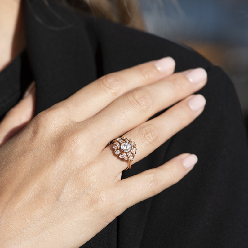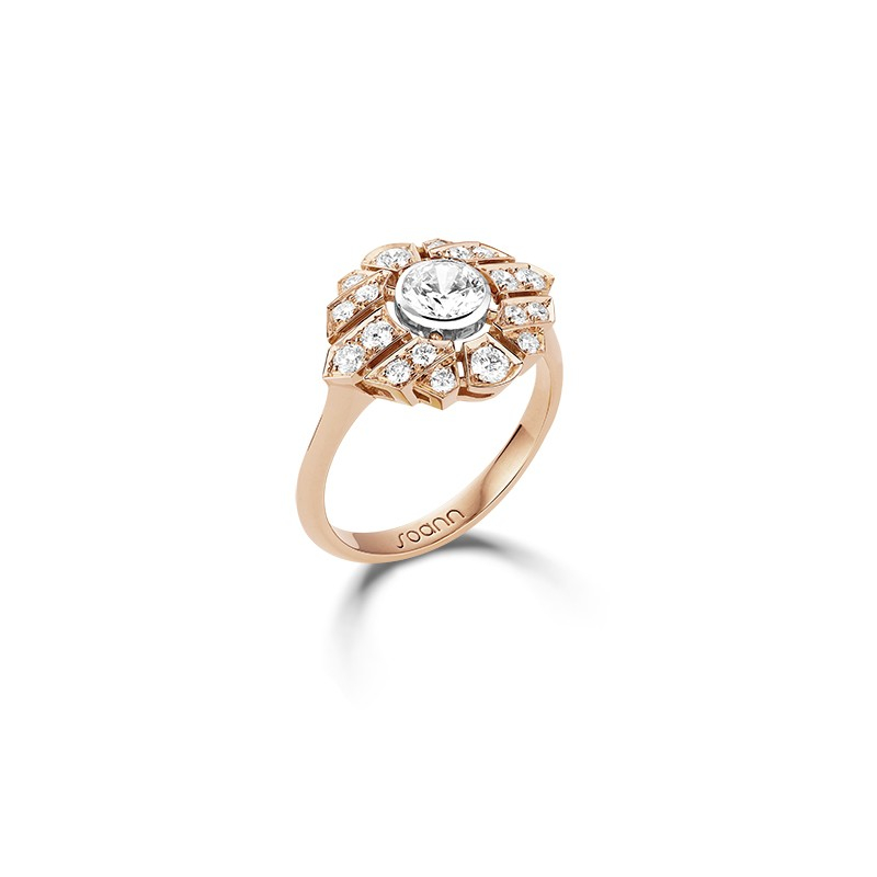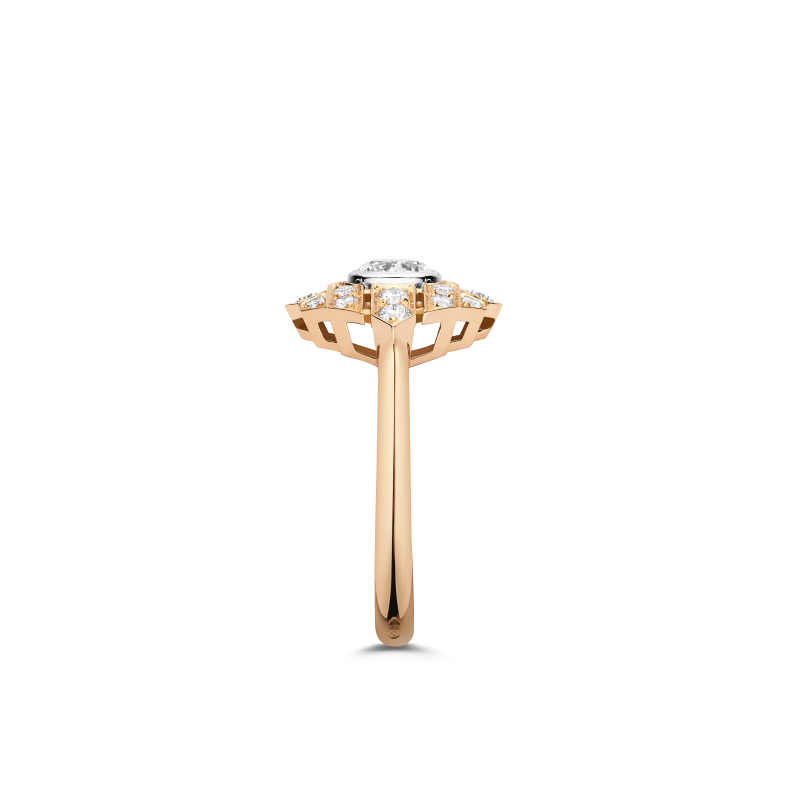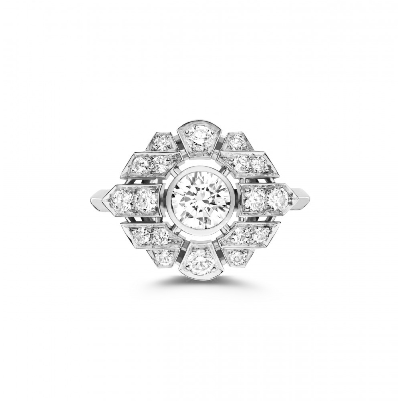Une nouvelle interprétation de la bague Charleston Baker fait son entrée dans la famille. Un jeu d’étages graphiques et de découpes structurantes pour cette bague tout en relief. Pétillante grâce à son sertissage mille grains, rappelant les costumes de la belle danseuse Joséphine Baker. Un duo d’or rose et de platine au niveau du serti donne à ce bijou une allure époustouflante.