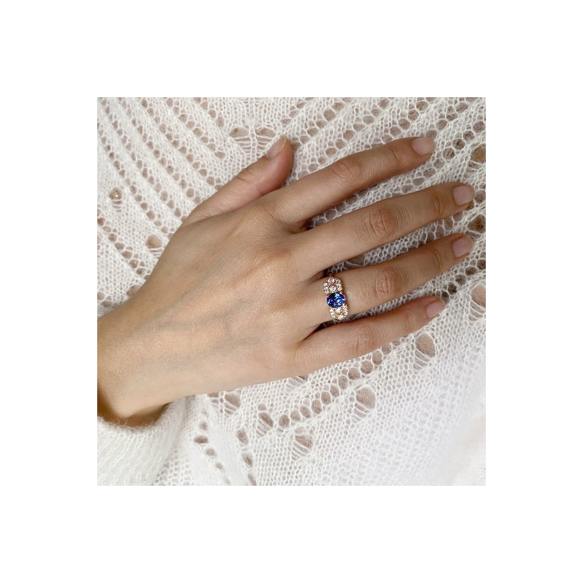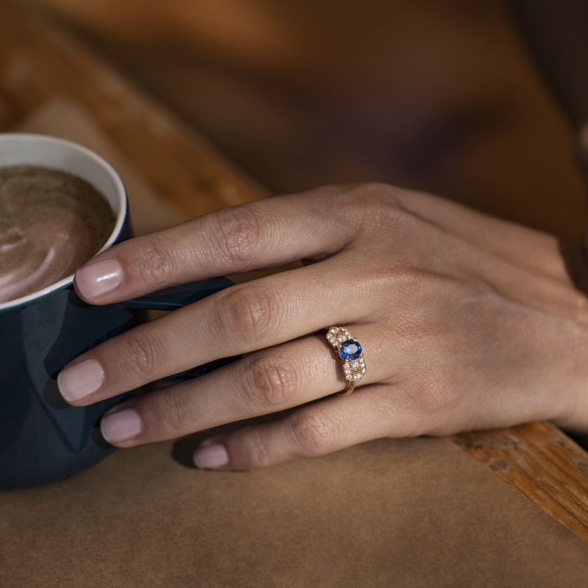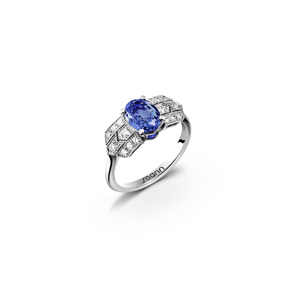Conçu comme une ode à l’élégance des années folles, la bague charleston saphir est ornée d’un sublime saphir à la couleur intense. L’éclat de cette splendide pierre répond à celui des nombreux diamants dans une harmonie subtile, à laquelle le serti millegrain vient apporter la touche de raffinement nécessaire à tous bijoux d’exception.