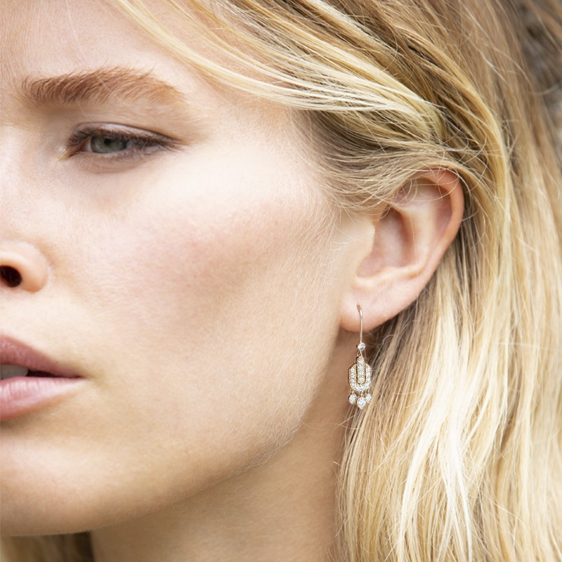 Fluidité et mobilité d’une paire de boucles d’oreilles lumineuses tout en légèreté. Pétillance des diamants blancs soulignée par des serti clos. Un style art déco revisité par un jeu articulé. Une finesse de fabrication vient souligner ce mélange du moderne et de l’ancien. Un style revisité pour les amateurs de cette époque joaillière indémodable.