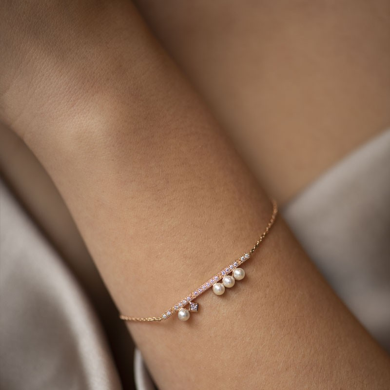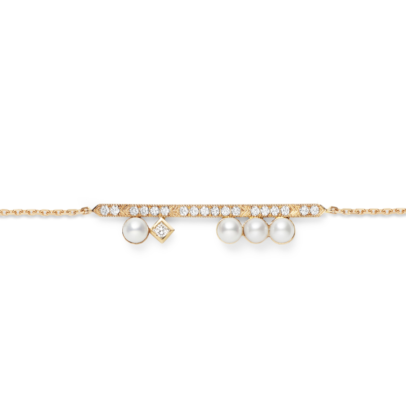 Le bracelet charleston perle dérive de la collection charleston et présente le motif emblématique de cette collection sous la forme d’une baguette en or sertie de diamants et divisée en sections de tailles décroissantes par de brillants traits d’échoppe en v. Cette barrette est agrémentée de perles pour apporter du volume et d’un diamant taille princesse qui attire l’œil. Le motif est élégamment courbé pour mieux se placer sur le poignet et maximiser le confort de celle qui le portera.