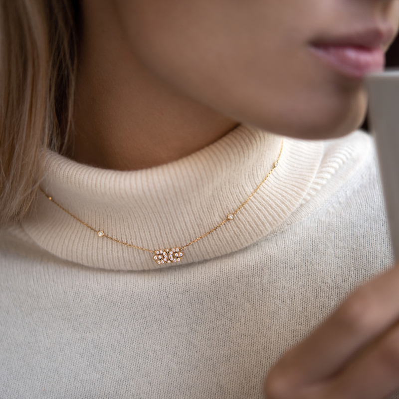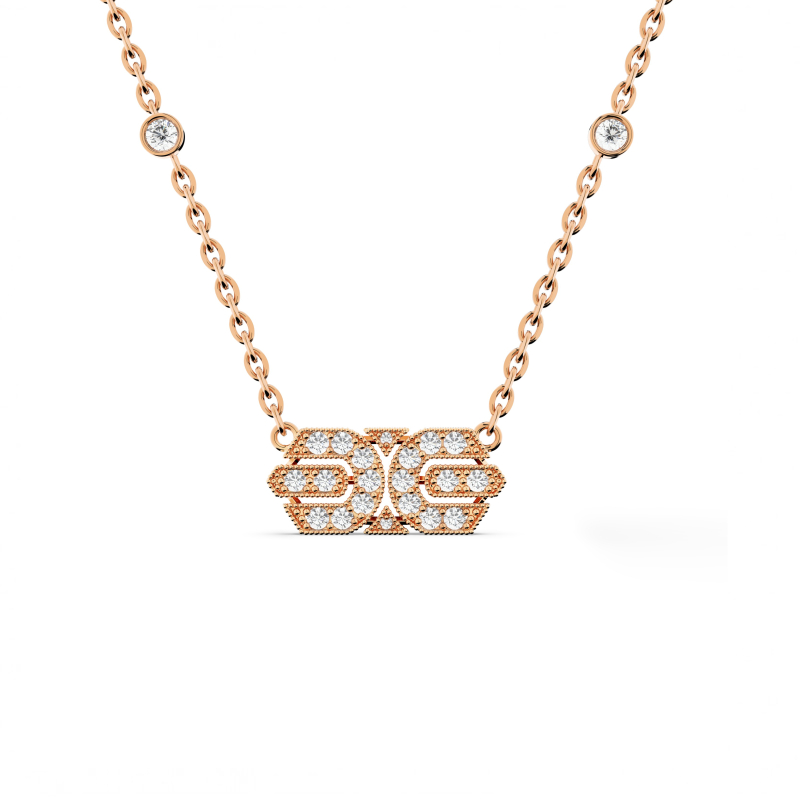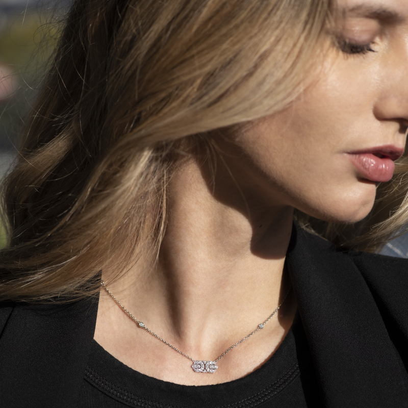 Ce bijou appartenant à la collection Charleston met l'accent sur le graphisme élégant du motif, condensé de l'esthétique Art déco. Les diamants viennent en rehausser l'éclat tandis que le serti millegrain apporte la touche finale à ce discret et ravissant pendentif.