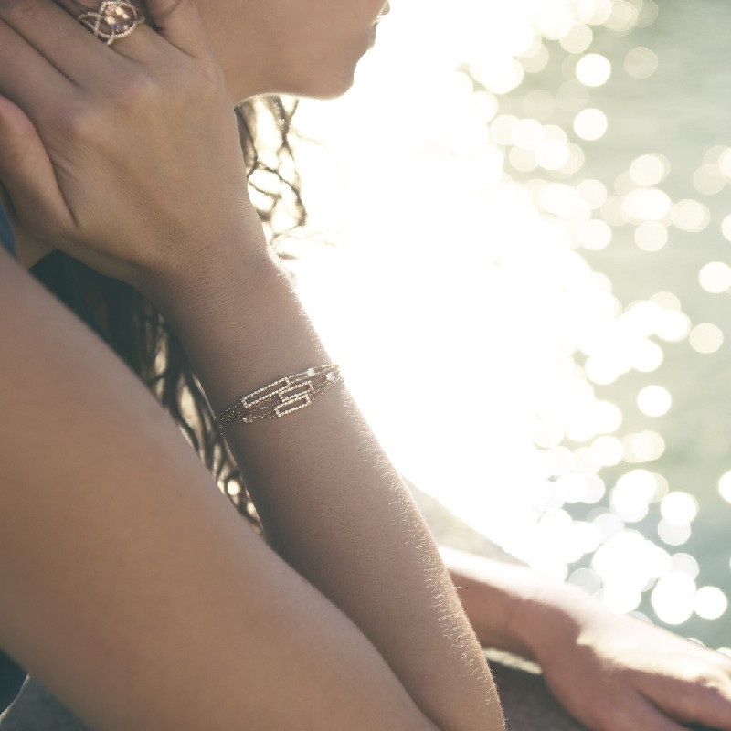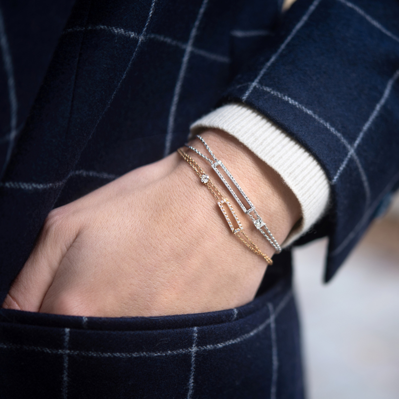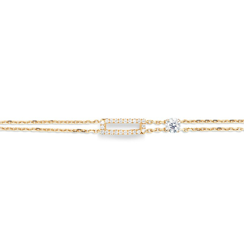 La structure Epure est pavée de diamants, fine, légère une élégance à la française. Le bracelet fin et orné du motif au twist hypnotique est complété par un diamant qui joint les deux chaînes ensembles.