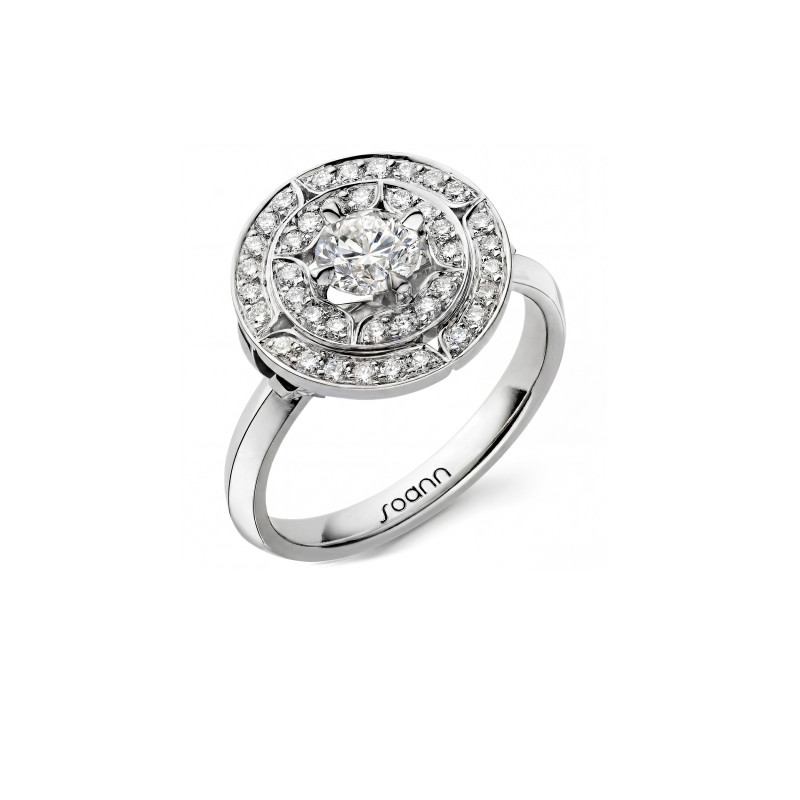 Le solitaire étoile est une galaxie de diamant. L’utilisation des rondeurs aussi bien dans la forme générale que pour l’anneau, lui confère une apparence fantastique et douce. Un design abouti pour une version aérée et délicate d’une bague incrustée d'une étoile de diamant centrale.