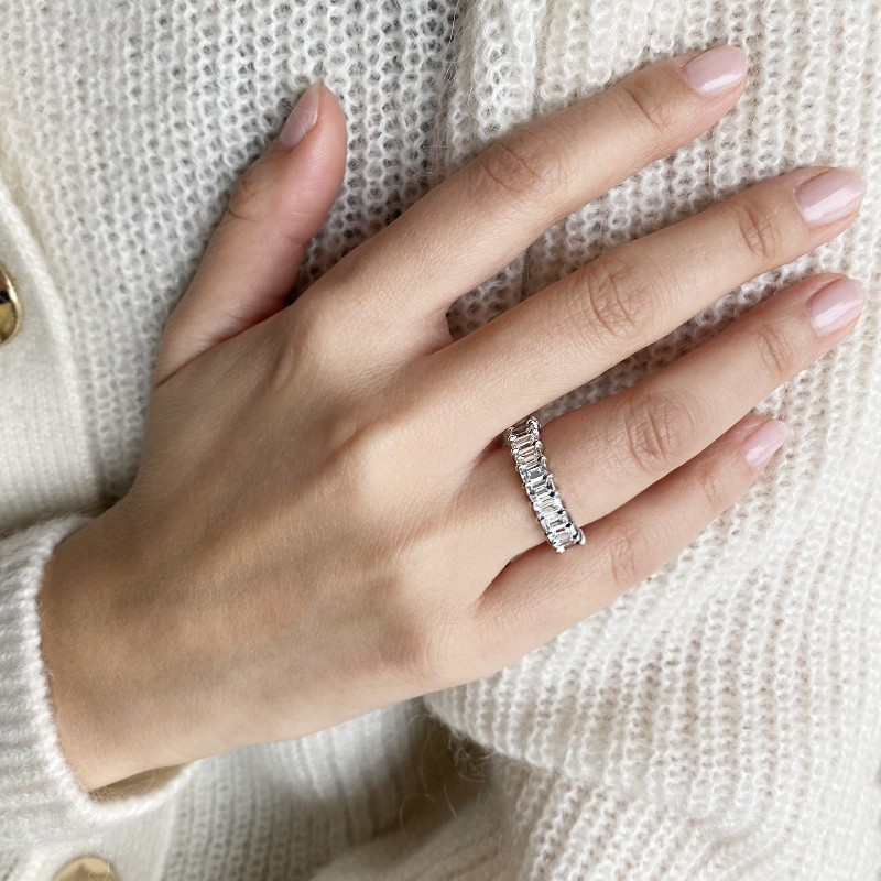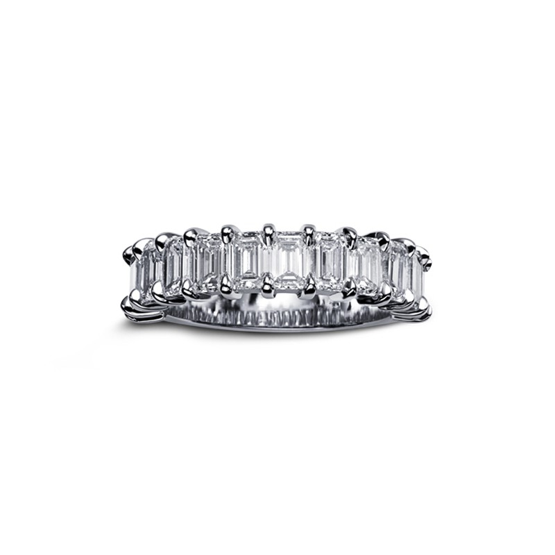 Cette alliance doit son éclat incomparable à l'utilisation de large diamants taille émeraude. Leur régularité structure cette bague tandis que la largeur de ses pierres modifie totalement le rythme du bijou le rendant plus imposant sans pour autant le départir de son charme.