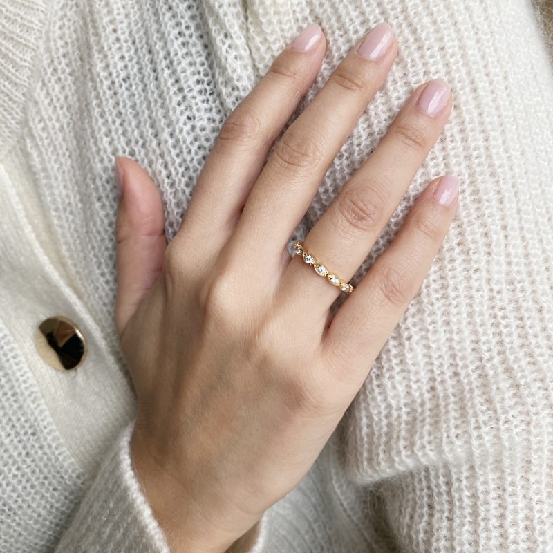Ornée de diamants taille brillants dont le serti reprends la forme d'une navette, cette alliance originale, tout en courbe, est d'une grande douceur au toucher ; un modèle féminin et discret.