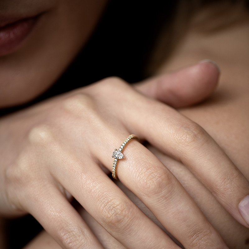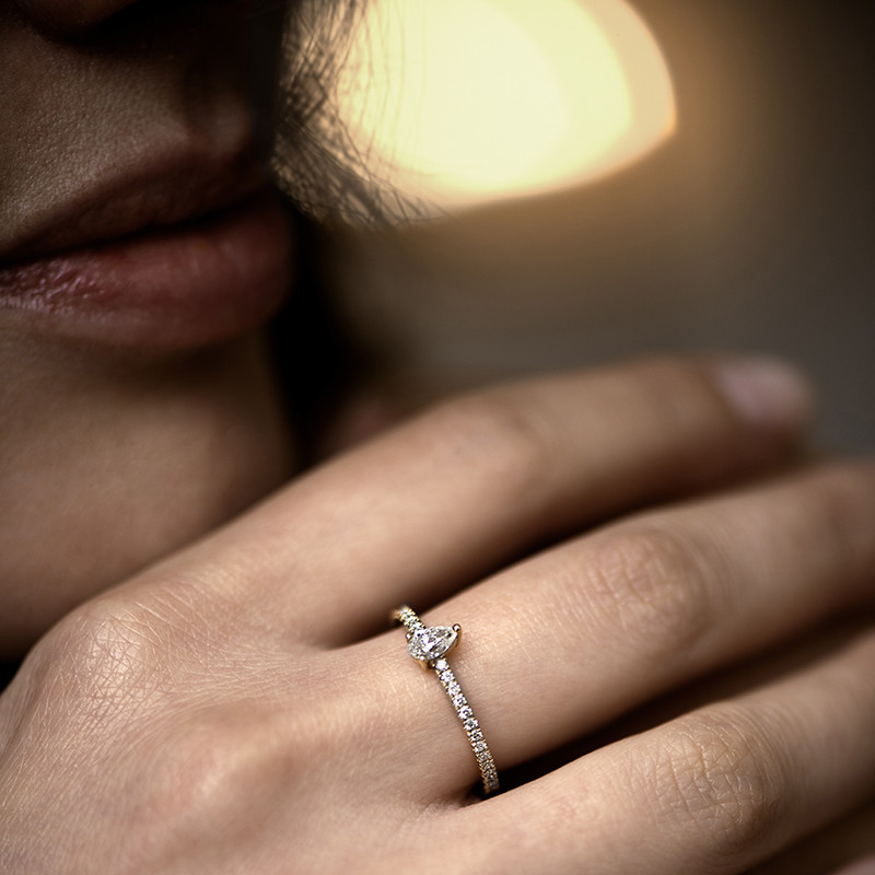 Le solitaire Harmonie est le solitaire minimaliste et pétillant par excellence. L’accompagnement du pavage de diamants sur le fin anneau apporte un éclat supplémentaire à la pierre centrale. Ici c’est le diamant poire qui a le rôle principal. Cette forme de goutte d’eau apporte de la fantaisie au classicisme du modèle.