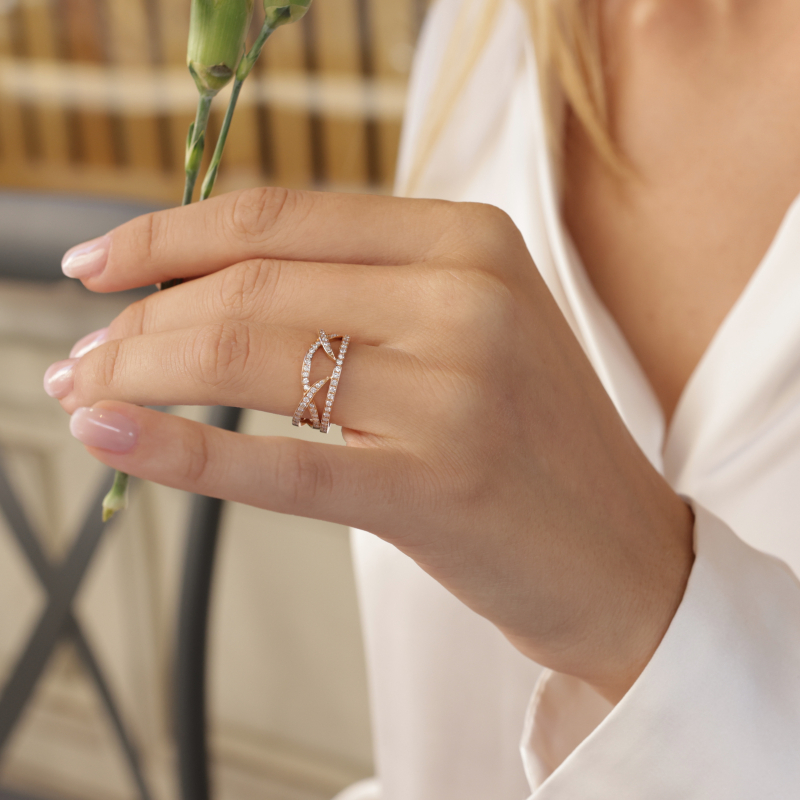 Cette bague de la collection Méandre Volute est incroyablement versatile et s’adapte au désir de chaque personne avec aisance. Cette alliance est un élégant mélange d’arceaux et de lignes fluides qui sait faire preuve d'originalité et de caractère. Un serti micropavé tout en légèreté est complété par un fin filet d’or pour finir la création avec harmonie.