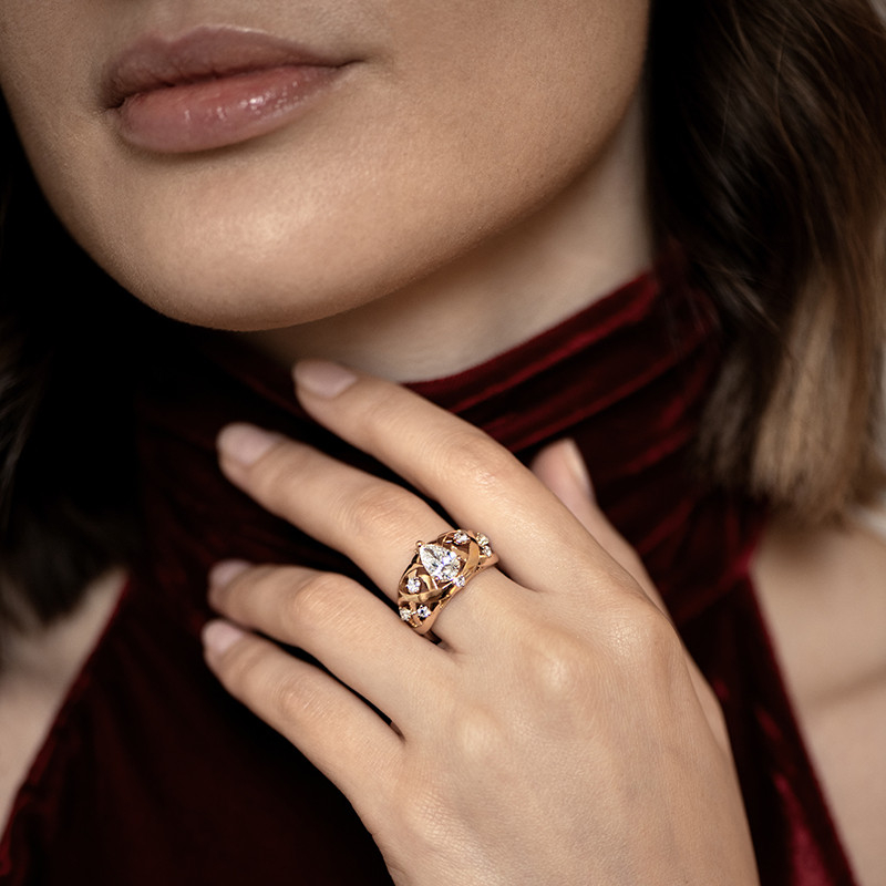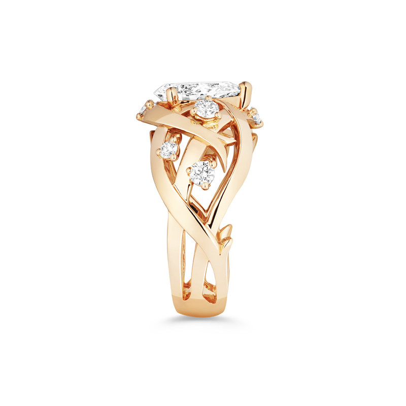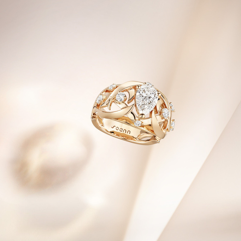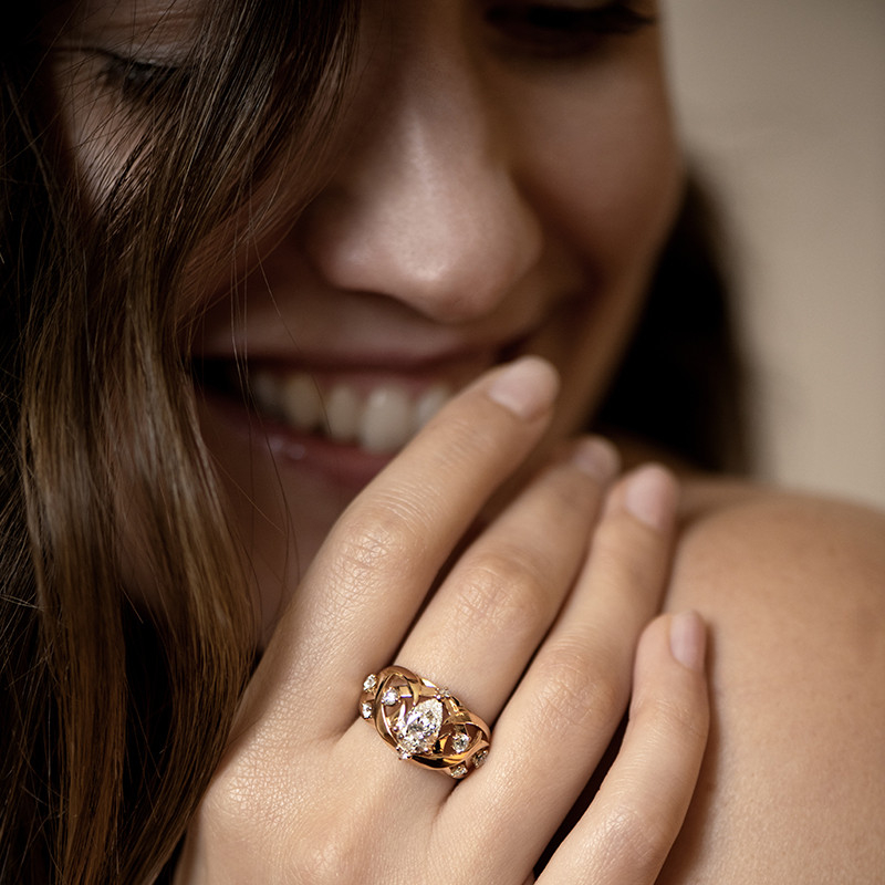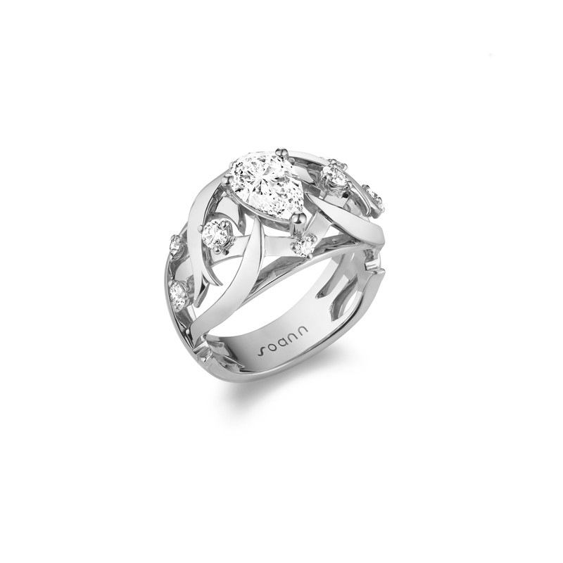 Cette bague Méandre-Bulle, issue de la nouvelle collection, s’inspire de l'élégance intemporelle de la bague méandre saphir et monte d’un cran en sophistication. Réinterprétée avec un diamant poire en pierre de centre, elle se pare de diamants délicatement dispersés sur la monture, sertis 3 griffes et en trois tailles différentes, ces éclats apportent légèreté et luminosité. Fidèle à ses courbes fluides et raffinées, ce modèle incarne une sophistication contemporaine empreinte de lumière.
