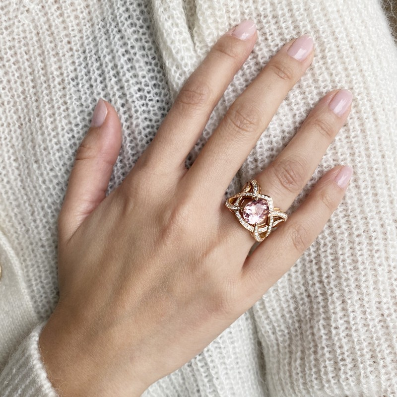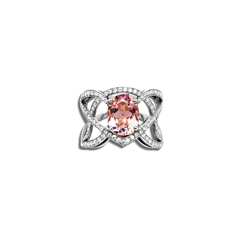 Le design Méandre à l'élégance intemporelle se trouve ici sublimé par le jeu des couleurs : le blanc éclatant des diamants, le rose poudré de l'or et celui, intense, de la morganite s'unissent en un camaïeu de couleur dont l'éclat réchauffe le coeur de celle qui la porte.