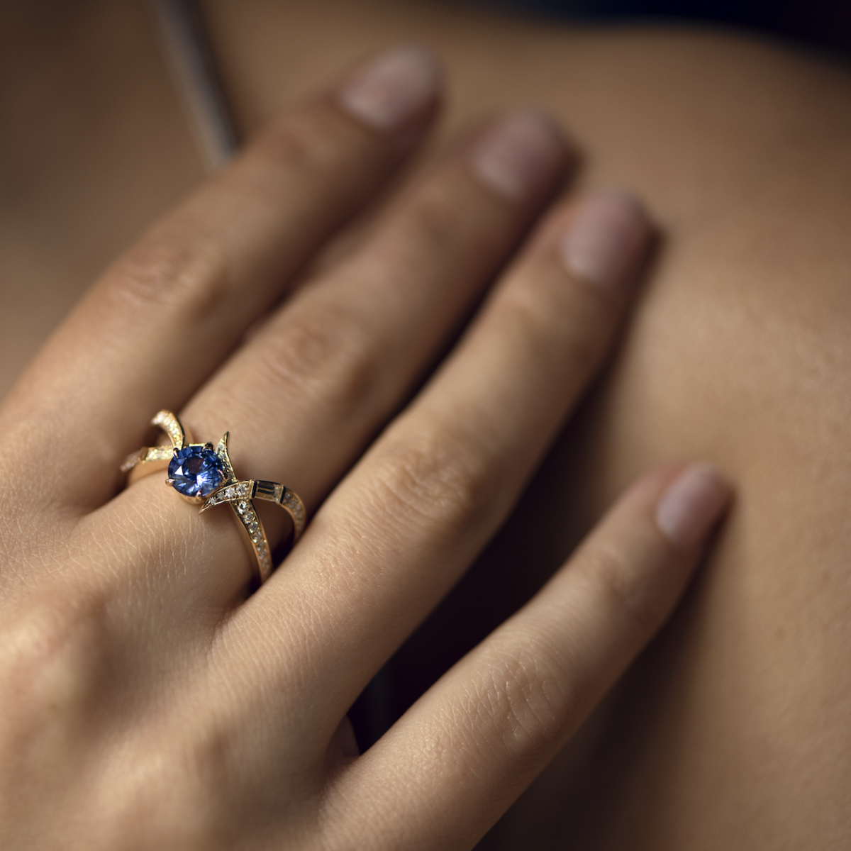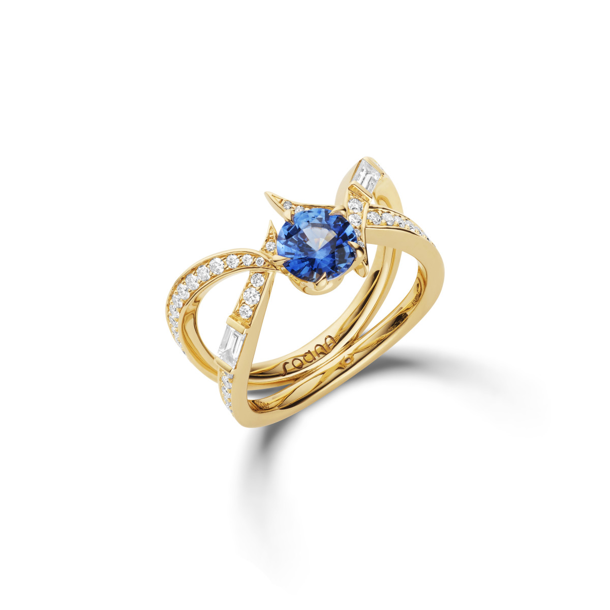 La bague Méandre Naïade est un bijou sophistiqué au caractère unique. Les diamants capturent la lumière et mettent ainsi en valeur un saphir bleu éclatant en son centre. Ornée de courbes élancées qui font toute l’élégance de ce modèle.