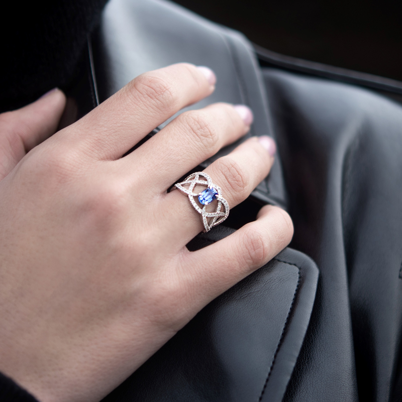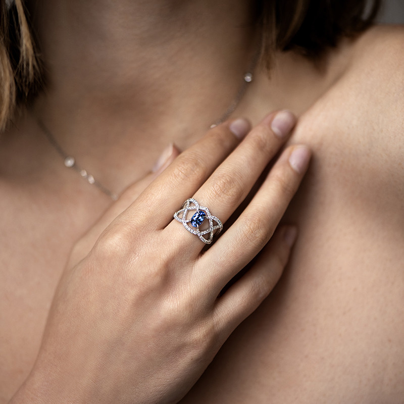 Modèle emblématique de la maison Soann réactualisé dans un design plus dynamique, la bague Méandreline saphir possède un charme ensorcelant. La légèreté de ses traits sublimés par le micro-pavage offre un écrin délicat et subtil au splendide saphir utilisé comme pierre de centre.