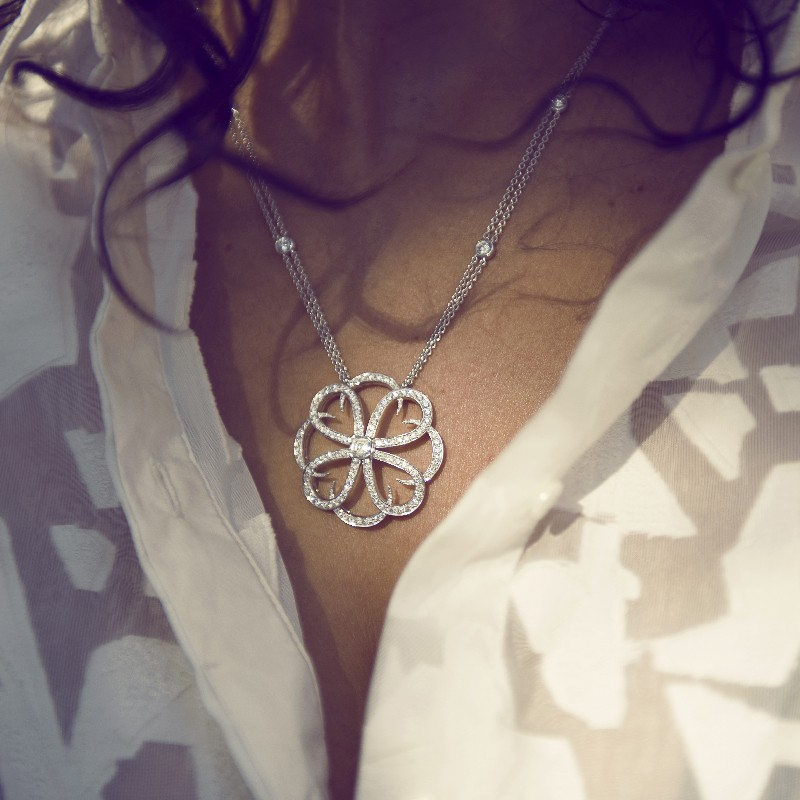 Le motif raffiné du trèfle, porte-bonheur par excellence, est mis en valeur par le pavage des diamants. La beauté de la pierre centrale complète le bijou, créant ainsi un précieux pendentif à la beauté scintillante.