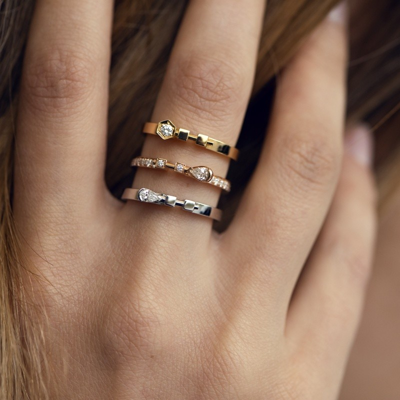 Simplicité synonyme de légèreté. Modèle sobre et chic, l'alliance Variation reflète à merveille l'univers de Soann. Un univers où l'élégance découle de la perfection des lignes épurées. Le clou hexagonal, structuré et graphique, ajoute la touche finale à ce bijou résolument contemporain.
