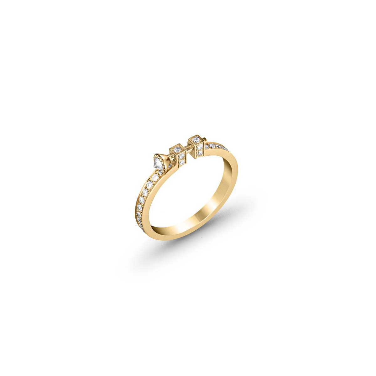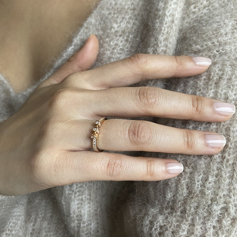 Cette bague au design épuré typique de la collection Variation est sertie de diamants jouant avec la lumière ; effet renforcé par le serti mille grains du clou poussant ainsi le raffinement de ce modèle à l'extrême.