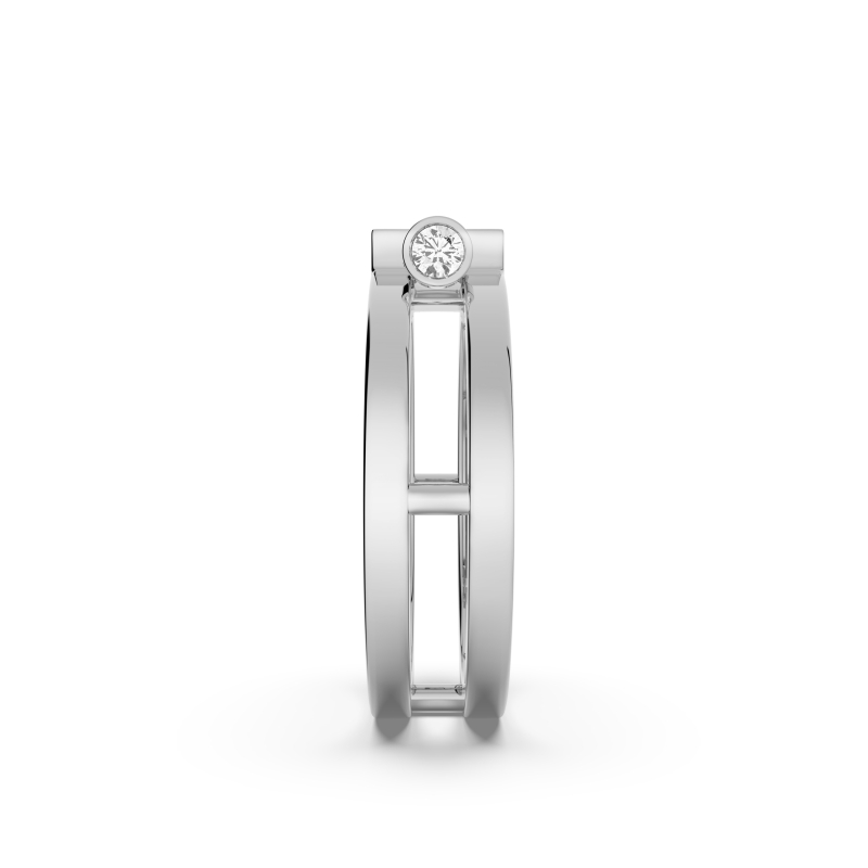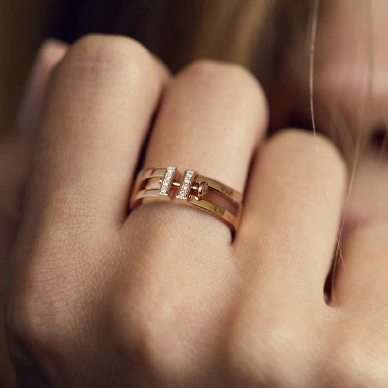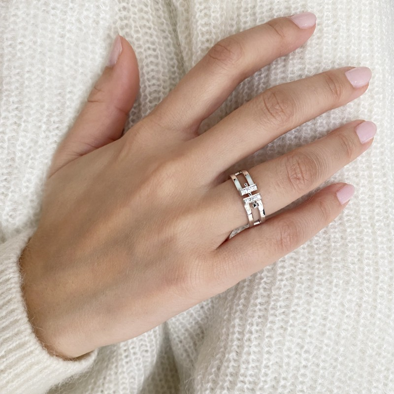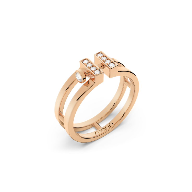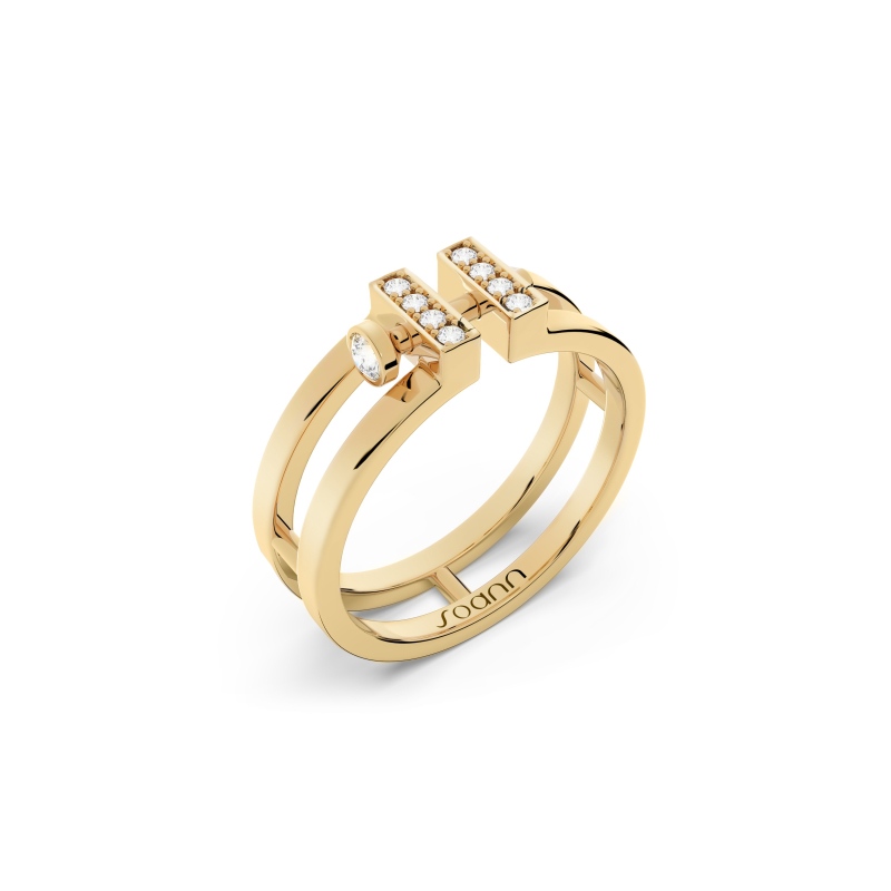 Dans la conception de la bague Variation open, Soann a voulu privilégier la légèreté et le confort. Ici, le modèle classique est enrichi d'une double ligne de diamants, tout en élégance.