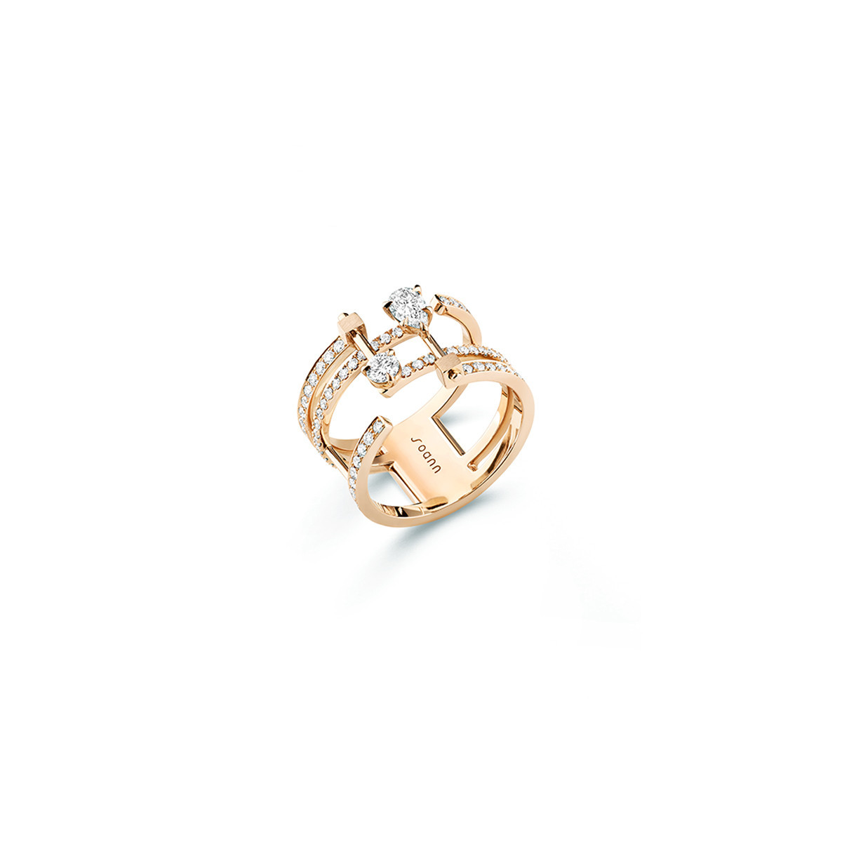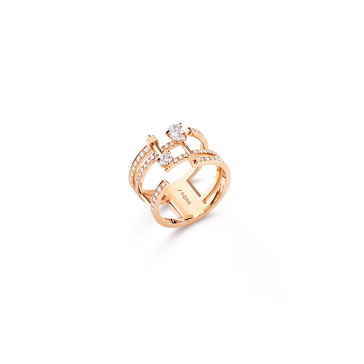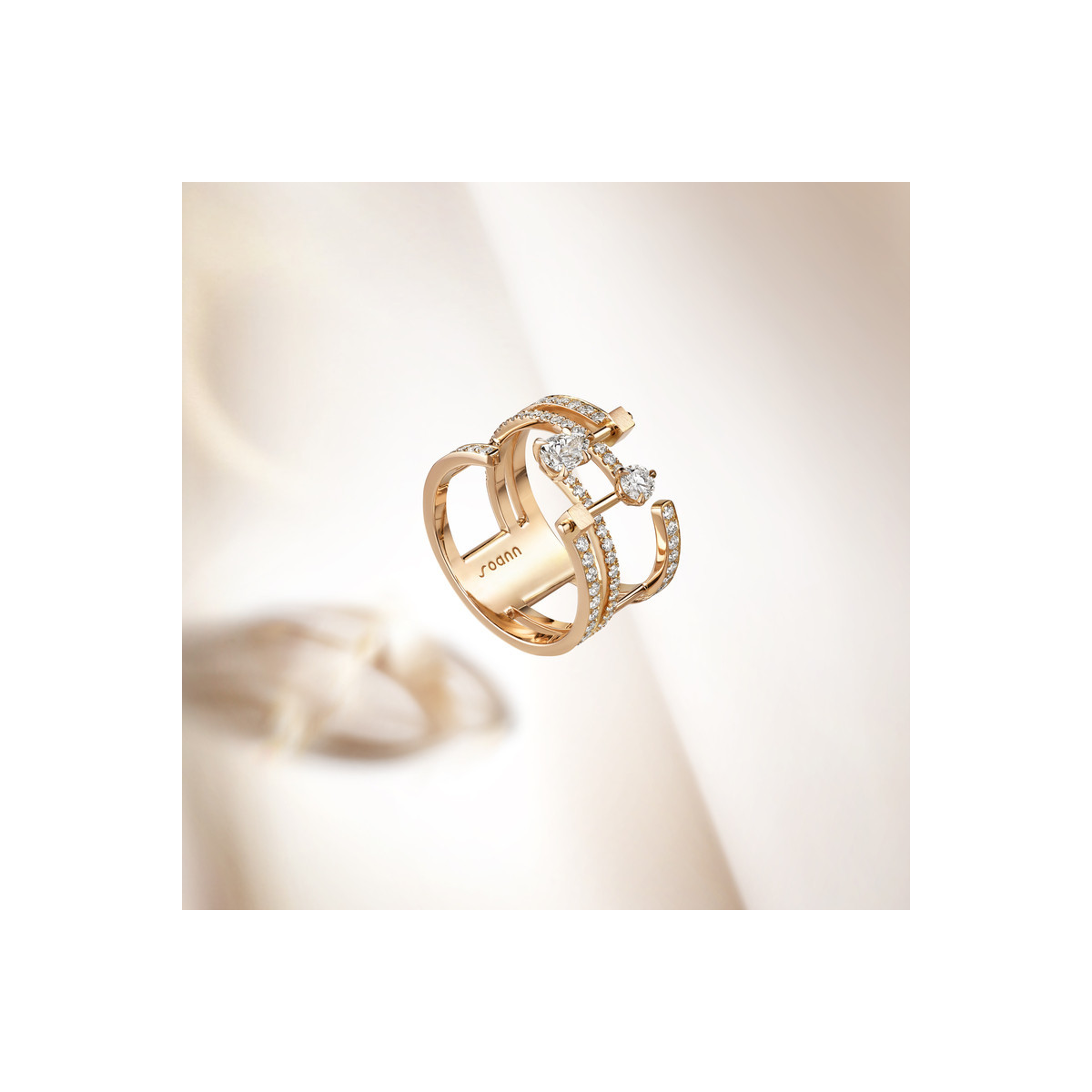 Depuis toujours, le « Toi et Moi » représente dans la joaillerie une figure de style incontournable de la bague de fiançailles, avec la mise en scène de deux pierres au centre symbolisant l’union. La maison Soann en propose aujourd’hui une relecture éblouissante et contemporaine en combinant le motif iconique du clou serti de la collection Variation avec son goût bien connu pour les architectures précieuses. Ici, les pierres précieuses sont à la fête avec les deux diamants (poire et rond de 0,30 ct ) et les pavages du corps de bague en assemblage sophistiqué d’anneaux d’or en symétries entrecroisées. L’ensemble brille de mille feux et exprime dans son audace de construction toute la magie et la richesse du lien amoureux. Toi et moi, toi émoi, toi aime moi… une création 100% Soann !