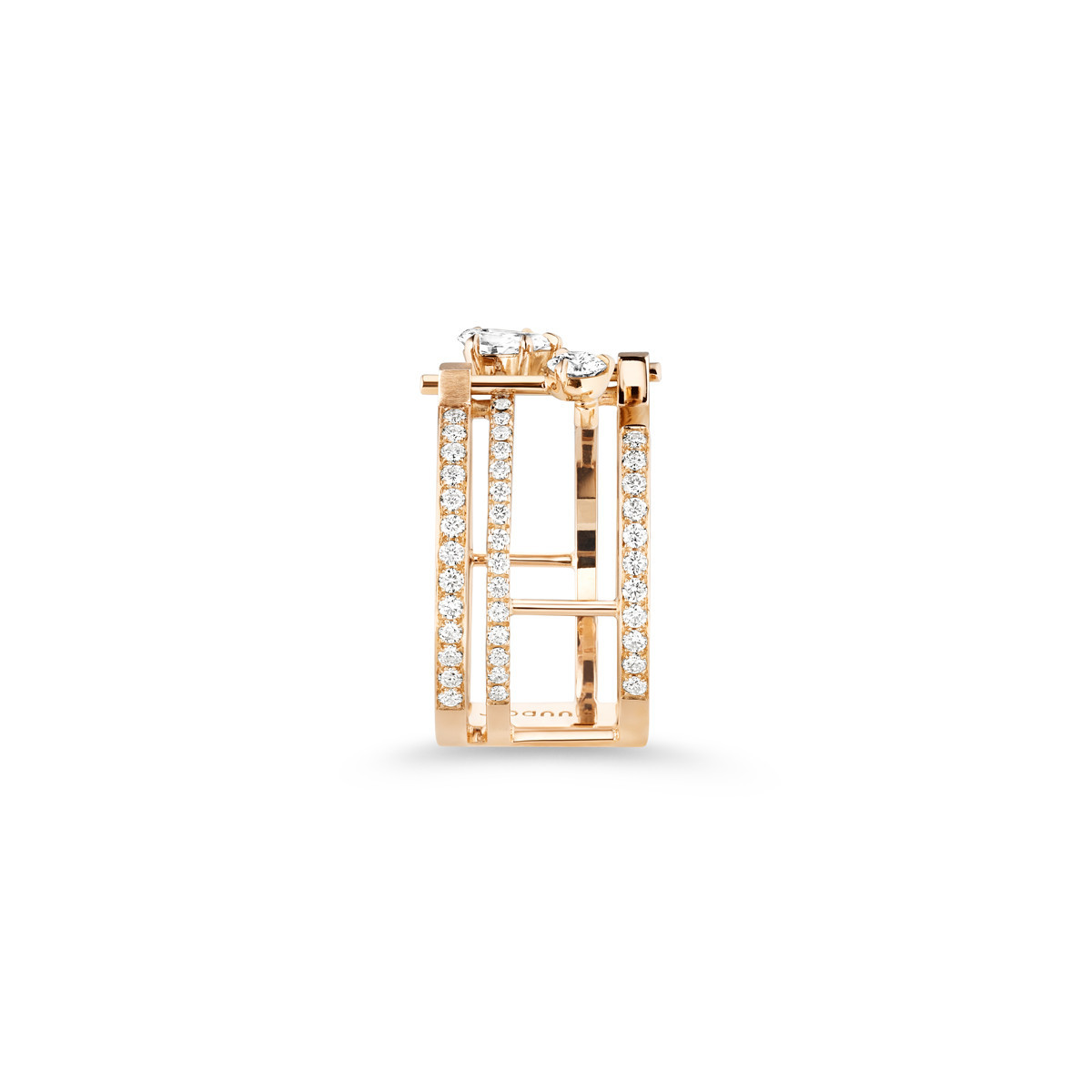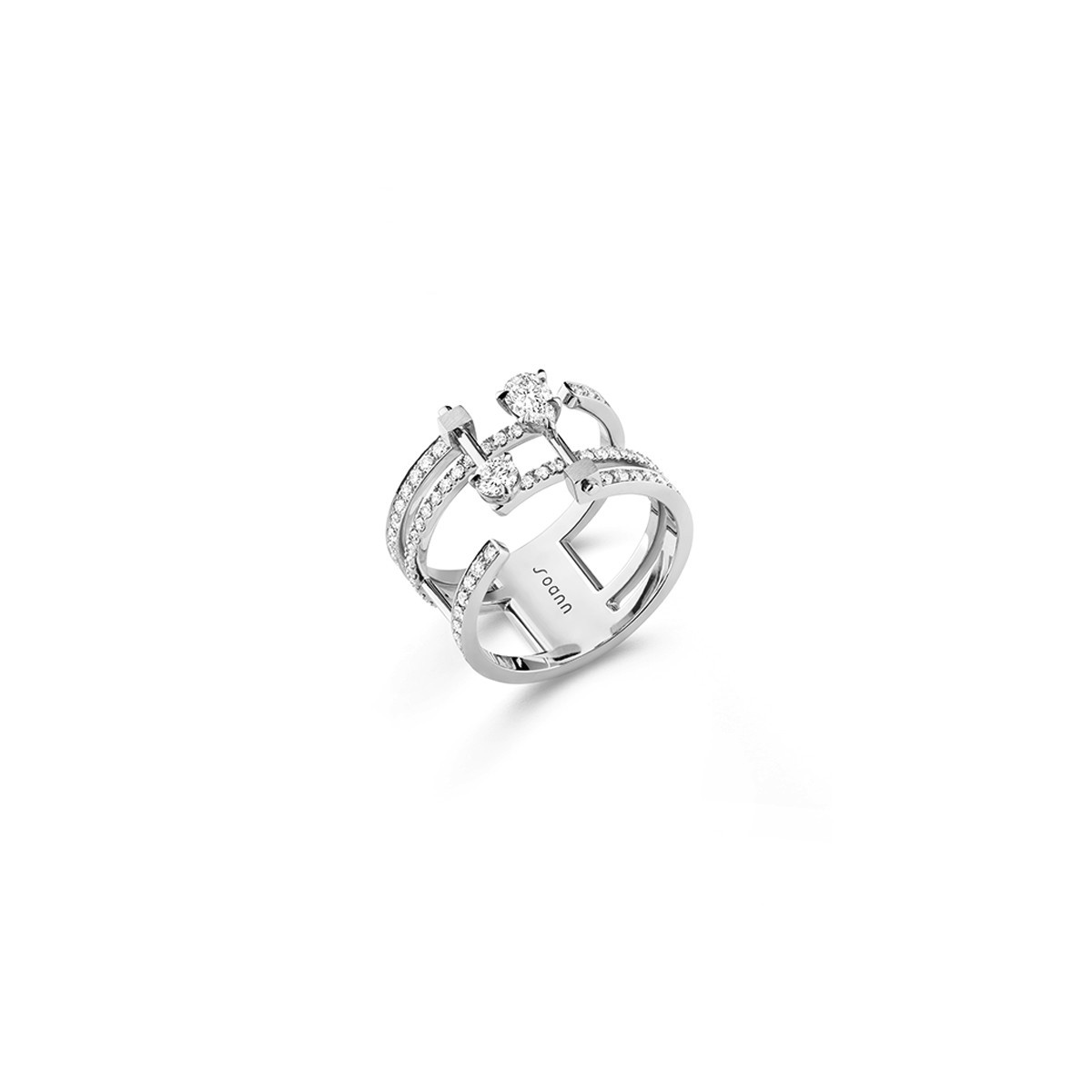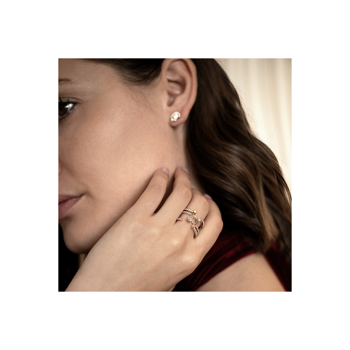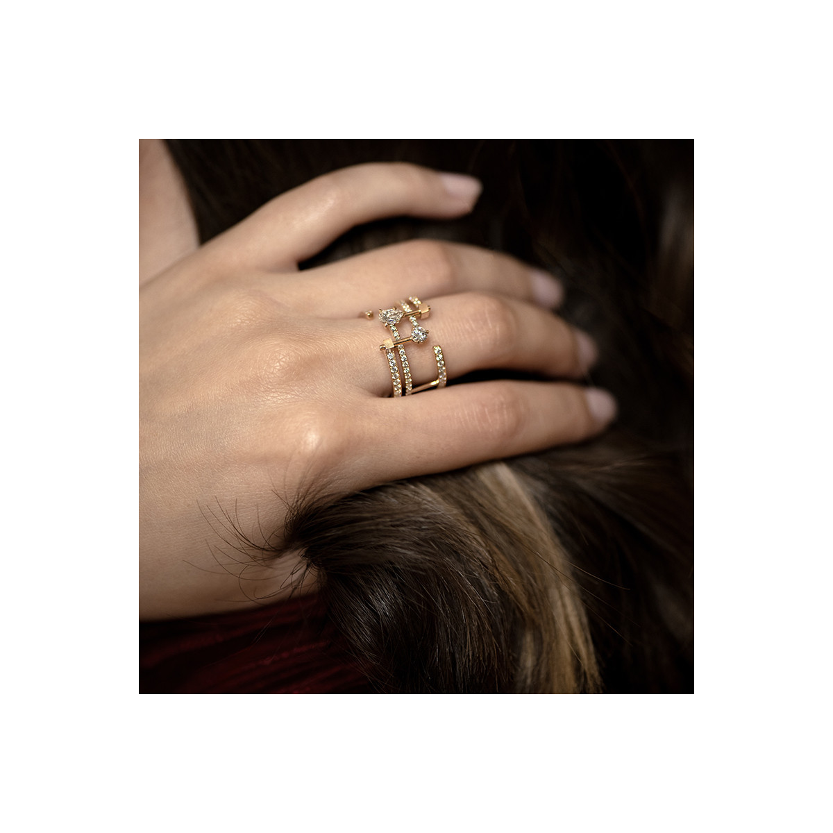 Depuis toujours, le « Toi et Moi » représente dans la joaillerie une figure de style incontournable de la bague de fiançailles, avec la mise en scène de deux pierres au centre symbolisant l’union. La maison Soann en propose aujourd’hui une relecture éblouissante et contemporaine en combinant le motif iconique du clou serti de la collection Variation avec son goût bien connu pour les architectures précieuses. Ici, les pierres précieuses sont à la fête avec les deux diamants (poire et rond de 0,30 ct ) et les pavages du corps de bague en assemblage sophistiqué d’anneaux d’or en symétries entrecroisées. L’ensemble brille de mille feux et exprime dans son audace de construction toute la magie et la richesse du lien amoureux. Toi et moi, toi émoi, toi aime moi… une création 100% Soann !