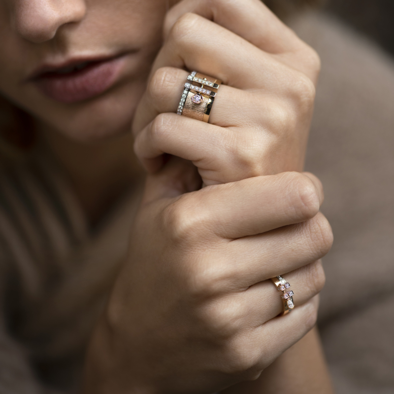 Synthèse du savoir-faire et du style de la maison Soann, cette bague combine, à elle seule, l'élégance d'un modèle aux lignes épurées et le raffinement de nombreuses textures.